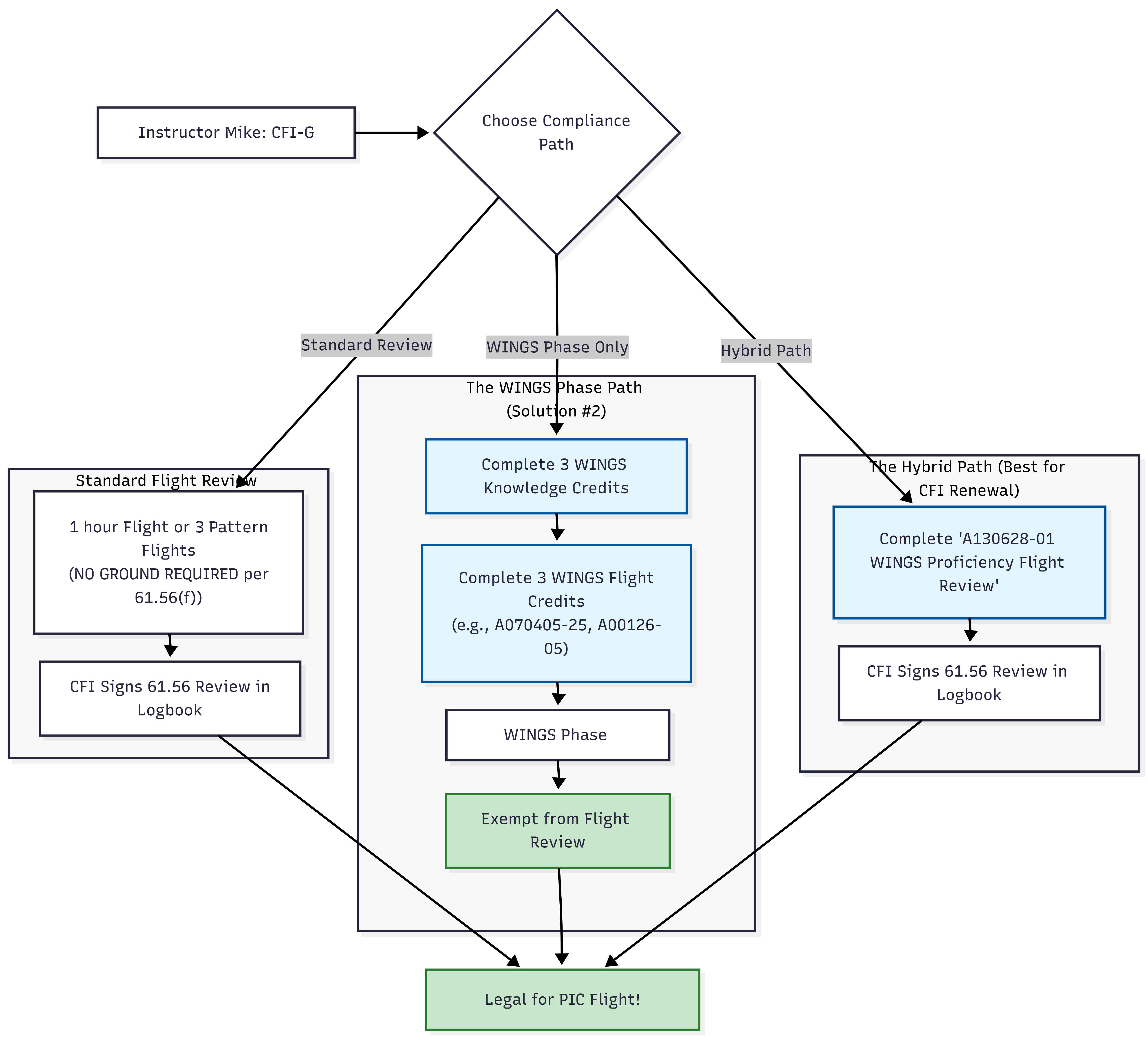 Solution #1: Instructor Mike can go do one hour of flight instruction in a glider with a certified flight instructor. If the instructor believes that all of the maneuvers are completed for a 61.56 flight review, the instructor must sign off Instructor Mike's log book indicating that a 61.56 flight review is completed. Since Instructor Mike is a certified flight instructor, he does not need to accomplish 1 hour of ground instruction, according to 14 CFR 61.56(f). It does not matter if Instructor Mike renewed via a FIRC, or by assigned activities, or by issuing enough WINGS credits. Since Mike is an active instructor, he need not complete the ground portion. Upon completion, the instructor who flew with Mike should log into WINGS and give credit for the flight activity named "A130628-01 WINGS Proficiency Flight Review"